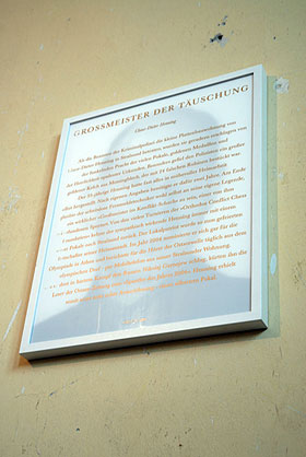 SVEN JOHNE Voriges Projekt | Nächstes Projekt Großmeister der Täuschung, 2005, Siebdruck auf Milchglas, sw-Fotografie, Sammlung Ivo Wessel Die einzelnen Geschichten der "Großmeister" sind in dieser Form fiktiv. Dennoch liegt jeder Geschichte ein wahrer Kern zugrunde: eine kurze Meldung in irgendeiner ostdeutschen Lokalzeitung, die Sven Johne während einer 5-wöchigen Fahrt durch Ostdeutschland sammelte. Irgendwann hatte er ein Dutzend unglaublicher Meldungen von Ostdeutschen, die allesamt ihr ungenutztes kreatives Potential nicht ungenutzt lassen wollten. Weitere Links: