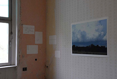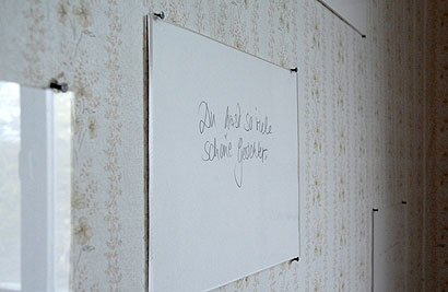THYRA SCHMIDT Voriges Projekt | Nächstes Projekt Landschaften # 9, #10, #19, 2006/07, jeweils: Videostill, Pigment Print auf Büttenpapier, 90 x 123 cm Die kurzen Textphrasen erzählen von zwischenmenschlichen Begebenheiten, Glück und Liebe. Sie sind entweder von Thyra Schmidt frei erfunden oder entstammen Literatur aus unterschiedlichen Epochen, von der Romantik bis heute (u. a. Bettine von Arnim, Charles Baudelaire, Thomas Bernhard, Christoph Hein). Ihre Textauswahl ließ die Künstlerin von 12 Personen handschriftlich schreiben. Weitere Links: